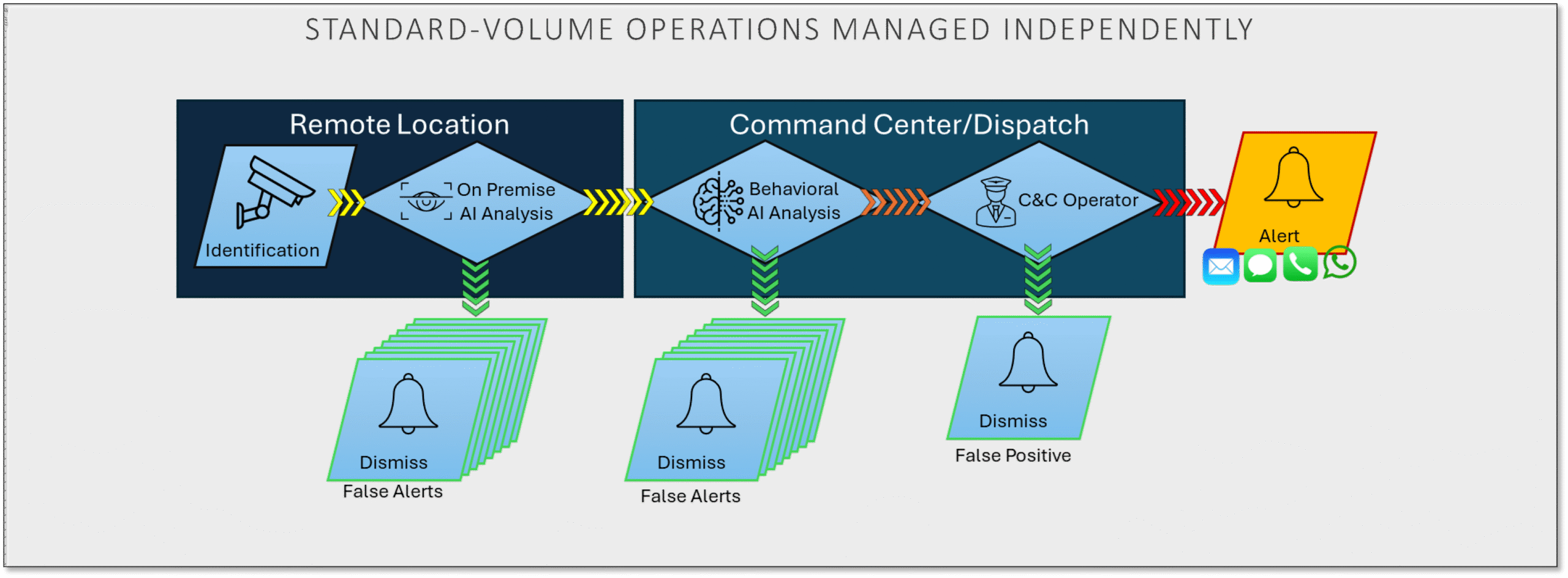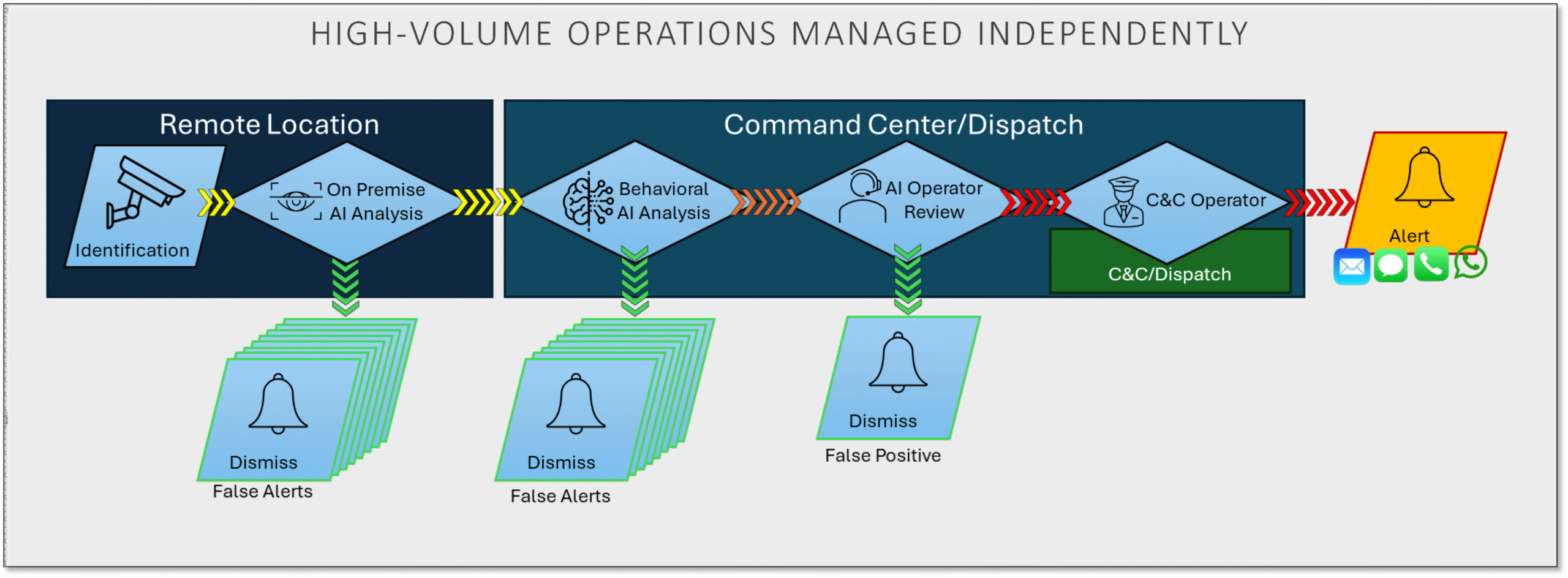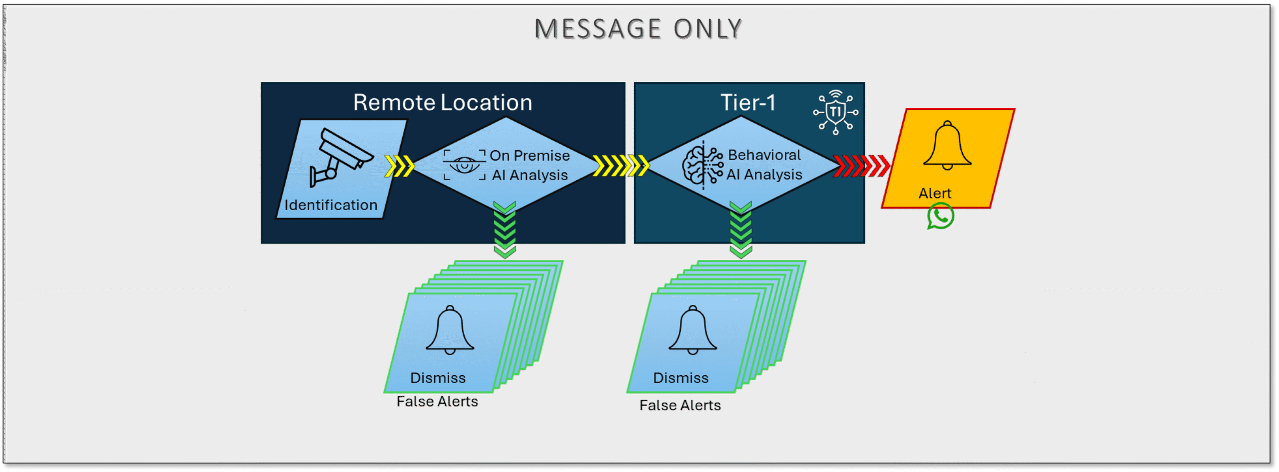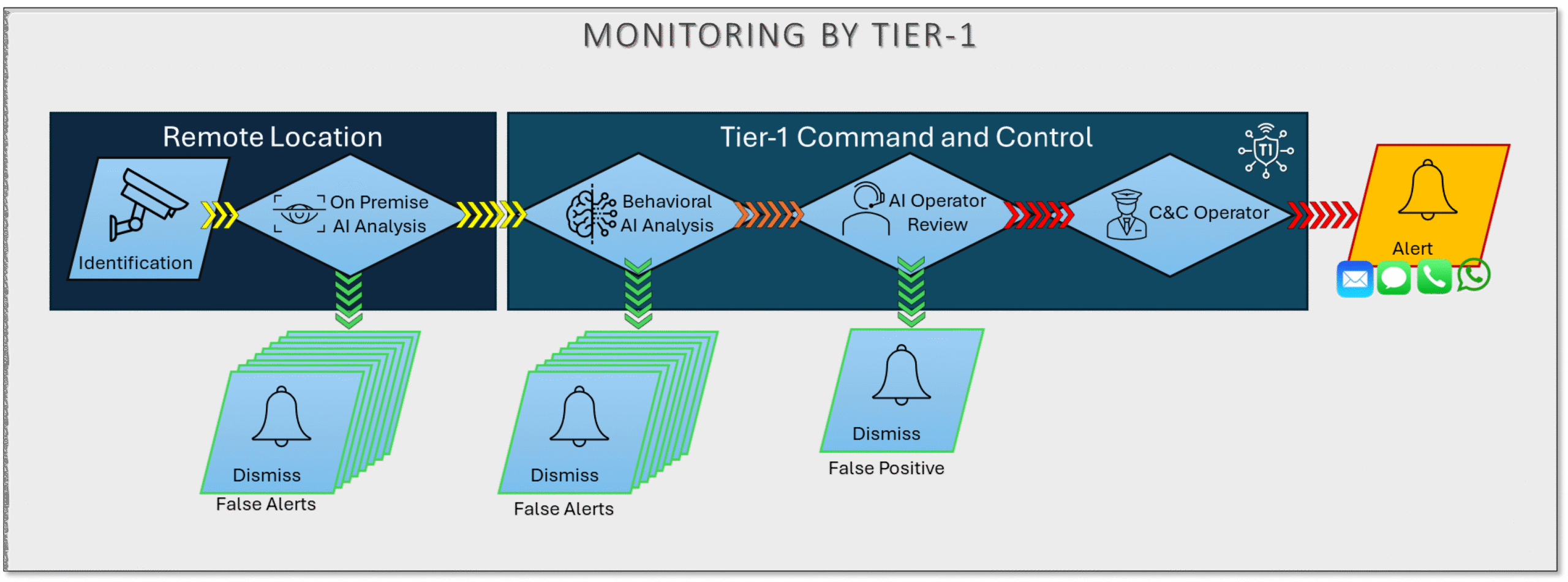 Introducing TIER-1 ANALYTICS, the advanced AI surveillance system that offers unmatched security and efficiency. Trusted by businesses and organizations worldwide, TIER-1 ANALYTICS has a proven track record of reducing false alarms and identifying suspicious activity with precision. Our dual-layer AI system elevates standard surveillance systems to a proactive, preemptive detection and warning tool, dismissing false alerts and alerting security teams and stakeholders in real-time. Alerts are screened by seasoned operatives, eliminating false positives, and communicating actionable information to designated contacts. With customizable rules that consider designated areas, object size and shape, movement, time constraints, and behavioral factors, multiple alerts can be combined and scheduled. The alerts are instantaneous. and include a picture highlighting the incident. An alert after human review arrives seconds later. Messages are sent to designated contacts and a short video clip of the incident can follow shortly.