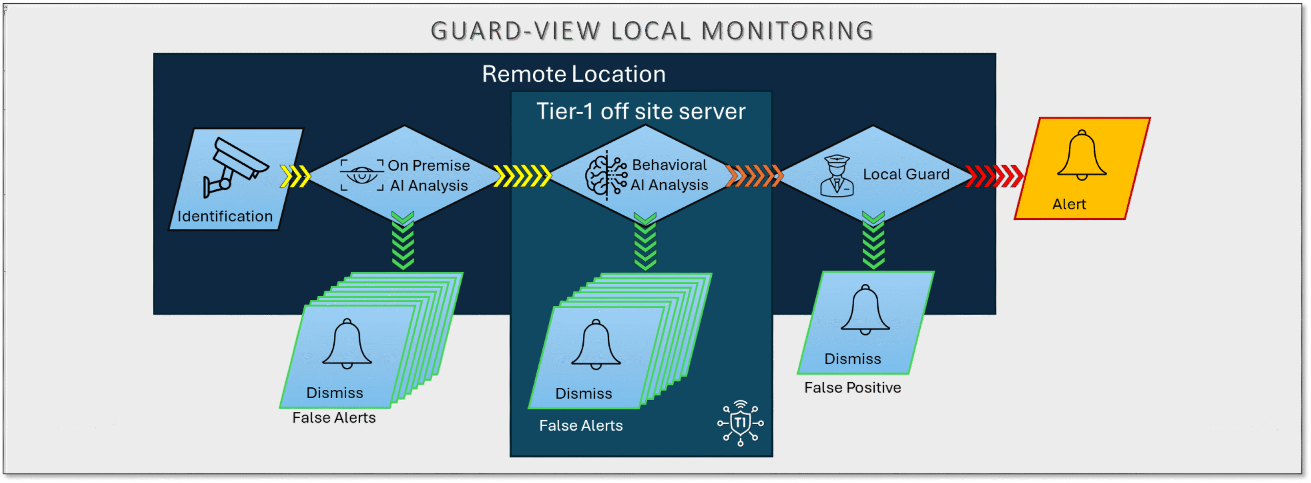 Tier-1 operates 24/7 as a “force multiplier” enhancing your security team’s capability to monitor remote facility locations while engaging other tasks. This makes the system both a “guard enhancement” and if needed a “guard replacement” system.